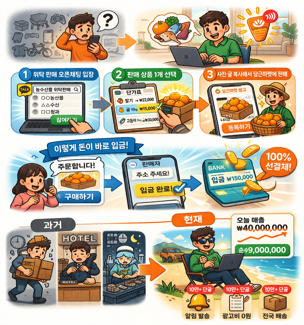 농수산물을 판다고 하면 대부분 "농장에 직접 가야 하나요?"라고 묻습니다. 전혀 그렇지 않습니다. 저는 집에서 노트북 하나로 모든 걸 해결합니다. 비밀은 '위탁 판매' 시스템입니다. 여기서 위탁 판매란 판매자가 직접 재고를 보유하지 않고, 공급업체가 재고를 관리하며 주문이 들어올 때마다 배송해 주는 방식을 의미합니다.