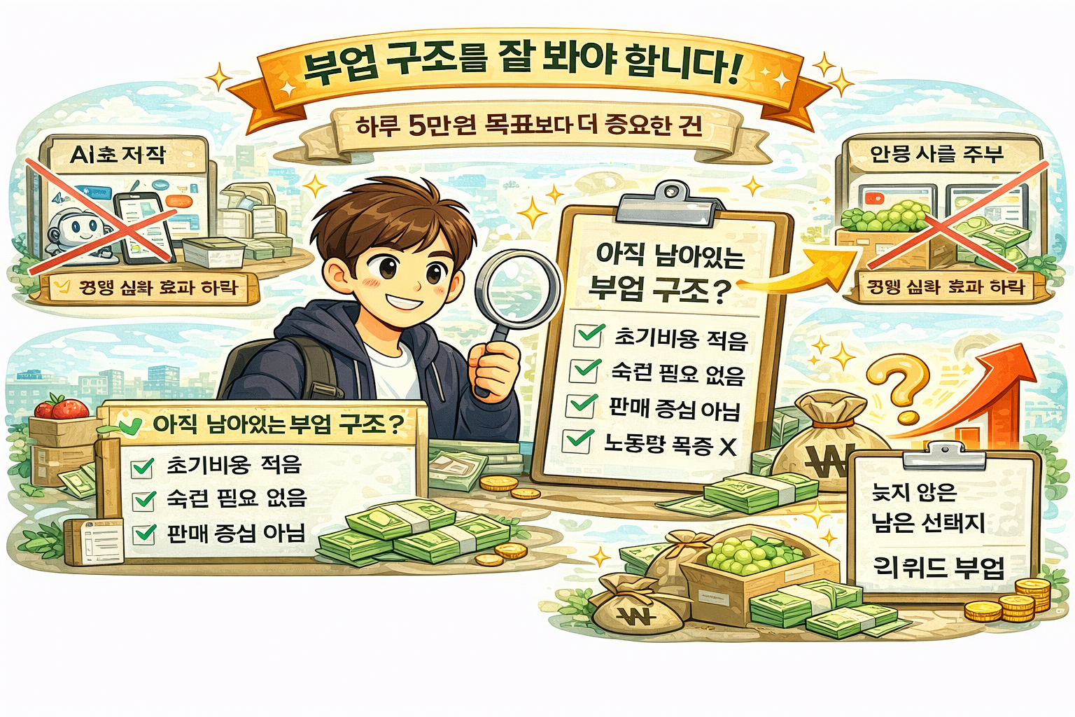 부업에서 실패를 반복했다면, 방법보다 구조를 먼저 보는 습관을 들이는 게 출발점입니다. 지금 당장 큰돈을 벌겠다는 목표보다, 지금도 작동하는 구조 하나를 확인하고 작게 시작하는 것이 훨씬 현실적입니다. 어떤 부업이든 뛰어들기 전에 이 구조가 언제까지 유효한 지부터 따져보시길 권합니다.