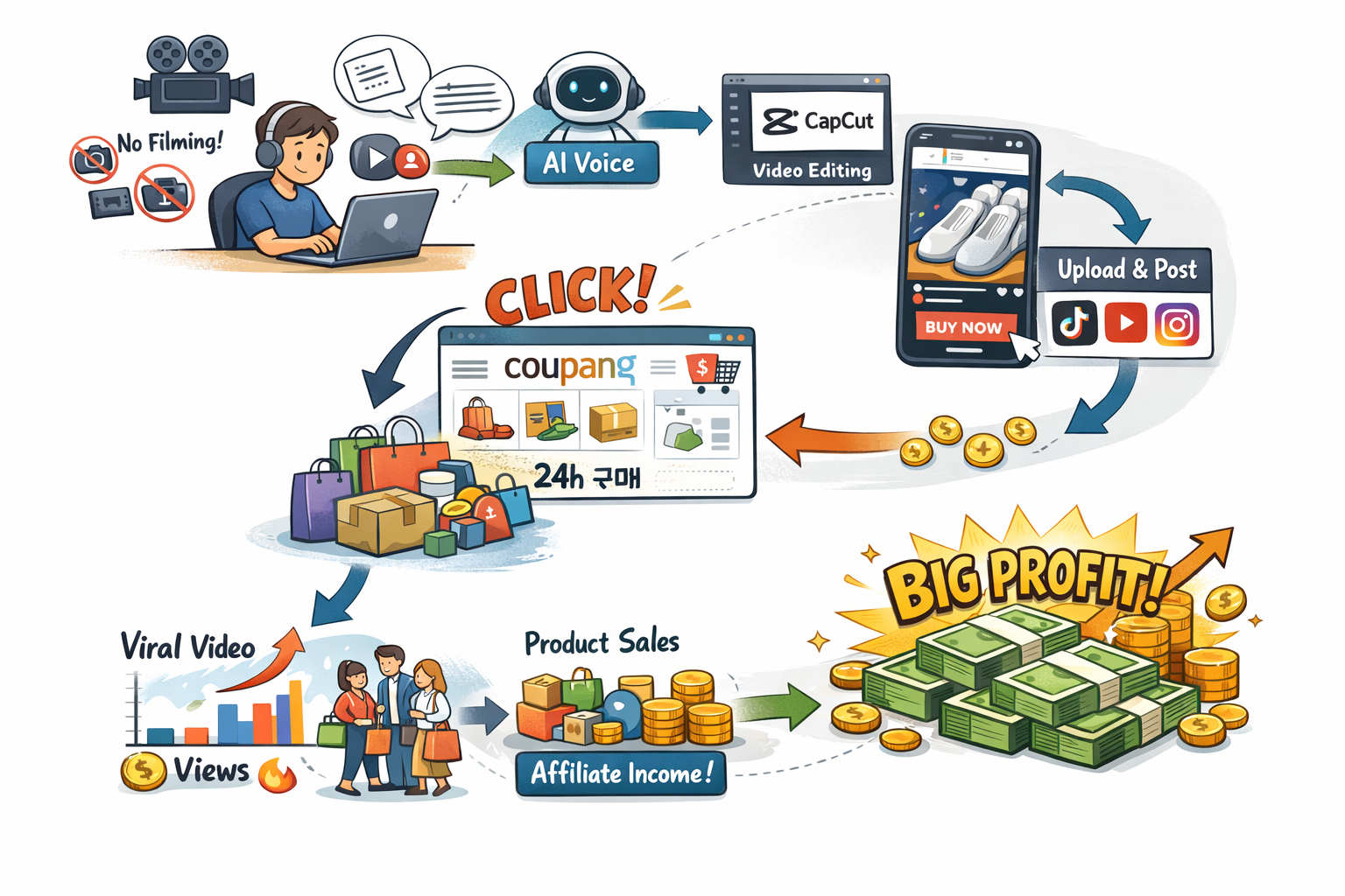 - 쿠팡 링크를 클릭한 사람이 24시간 내 구매한 모든 제품이 수익 대상