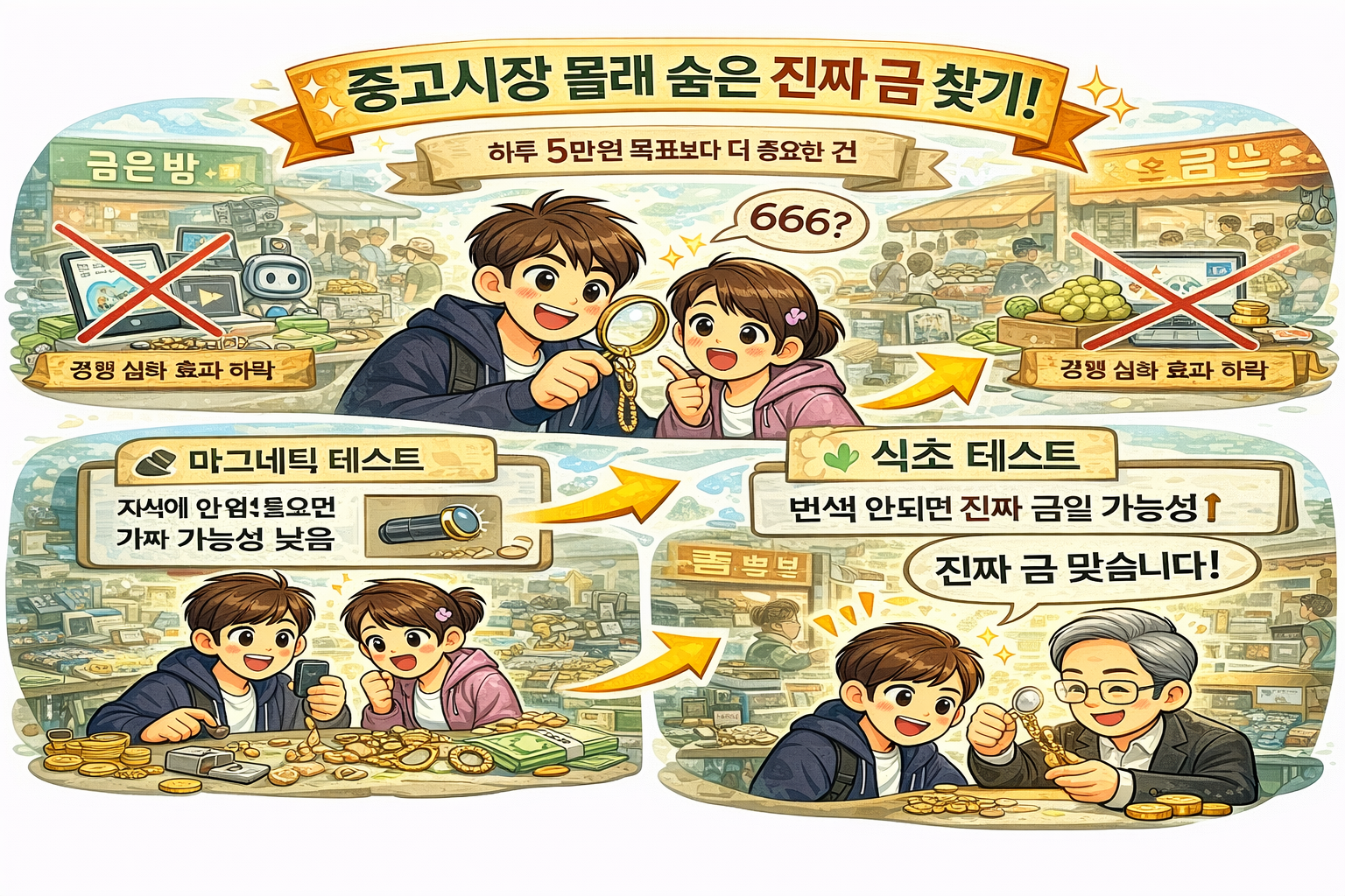 시장에 들어서면 가장 먼저 압도되는 건 물건의 종류입니다. 카메라 렌즈, 지포 라이터, 캠코더, 캐릭터 피겨, 그리고 주얼리까지 뒤섞여 있는 공간에서 금을 찾는다는 게 처음엔 그냥 웃기게 느껴졌습니다. 근데 막상 돌아다니다 보면 어느 순간 진지해집니다. 제가 직접 자석을 들고 반지 하나하나에 가져다 대보는데, 손이 떨리는 건 아니었지만 뭔가 찾아낼 것 같은 기분이 드는 게 사실이었습니다.